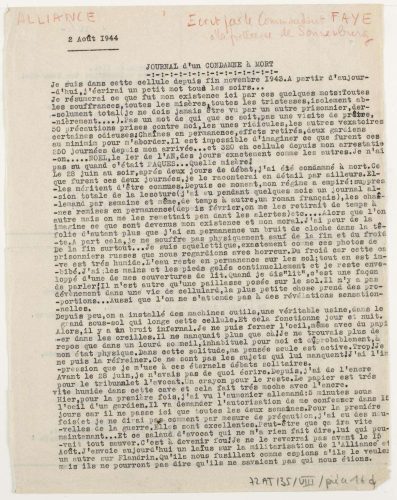Journal d’un condamné à mort – Ecrit par le Commandant Faye le 2 août 1944 à la forteresse de Sonnenburg Partager : Partager sur X(ouvre dans une nouvelle fenêtre) X Partager sur Facebook(ouvre dans une nouvelle fenêtre) Facebook J’aime chargement… Articles similaires