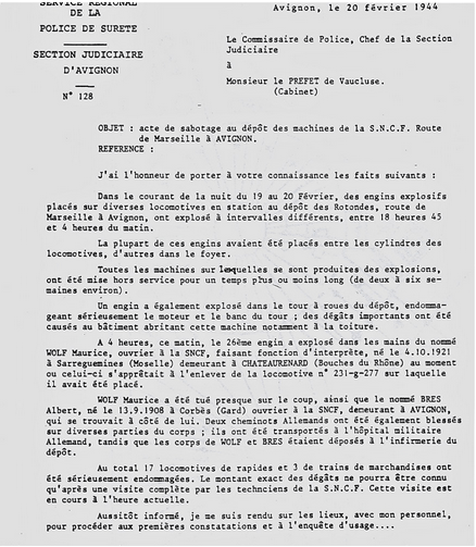 Manœuvre à l’essai au dépôt SNCF d’Avignon, Maurice Wolff alias « Richard », sans doute réfugié lorrain dans le Vaucluse, était membre du sous-réseau Druides, rattaché au réseau de renseignement Alliance. La Résistance ayant organisé dans la nuit du 19 au 20 février 1944 un sabotage spectaculaire dans le dépôt (dix-sept locomotives endommagées), il fut contraint par les Allemands, vers 4 heures du matin, avec un autre manœuvre, Albert Bres*, d’enlever les bombes non explosées. Les deux hommes furent mortellement blessés par l’un des engins.