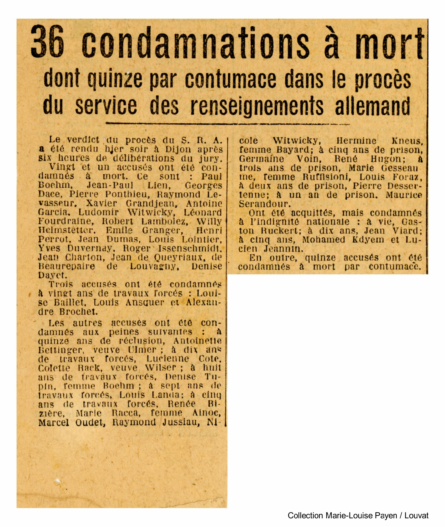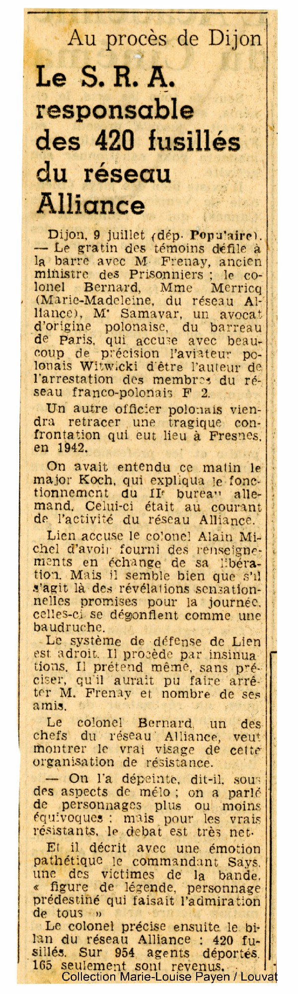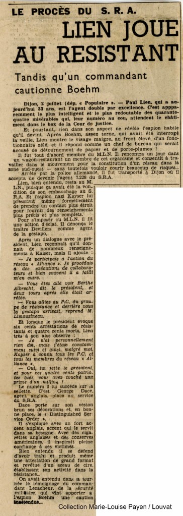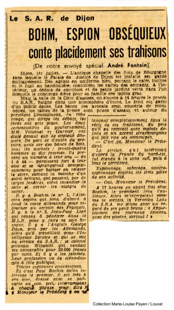 Dijon fut pendant la guerre le centre d’une des principales subdivisions du service. De la capitale bourguignonne le réseau s’étendait sur plus de dix départements ; il s’élargissait jusqu’à la zone sud, notamment Lyon, Grenoble, Marseille. C’est pourquoi l’affaire instruite par M. Bouchard a revêtu une telle ampleur.