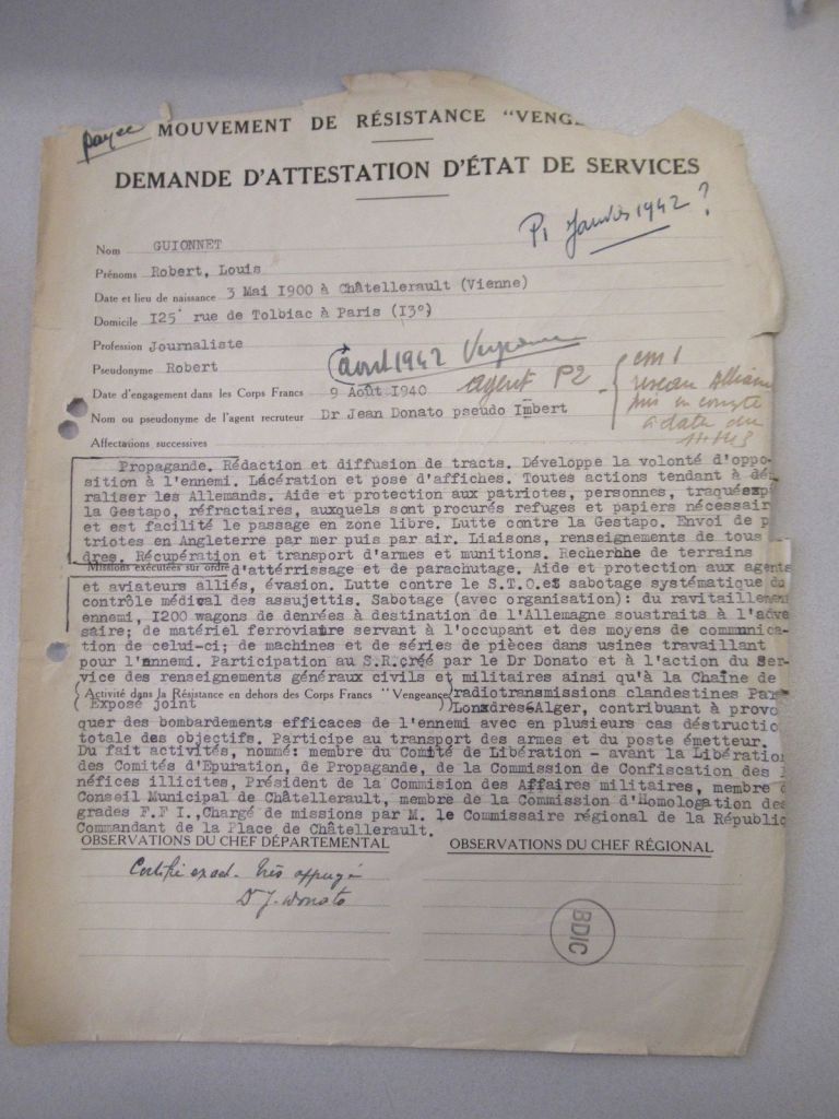 – Attestation du Commissaire de Police Charles BICHAT, agent P1 de Turma Vengeance et Alliance et Lieutenant FFI, en faveur de Robert GUIONNET (pages 8 à 10)
