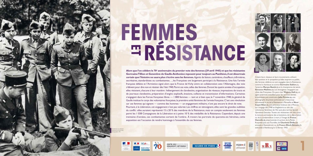 Alors que l’on célèbre le 70e anniversaire du premier vote des femmes (29 avril 1945) et que les résistantes Germaine Tillion et Geneviève de Gaulle-Anthonioz reposent pour toujours au Panthéon, il est désormais certain que l’histoire ne saura plus s’écrire sans les femmes. Agents de liaison, cantinières, chauffeurs, infirmières, secrétaires, standardistes ou combattantes…, les Françaises ont largement participé à la Résistance. Une fois l’armée française défaite et l’Armistice signé alors que la France de Vichy entre en collaboration avec l’Allemagne, des voix s’élèvent pour dire non et résister dès l’été 1940. Parmi ces voix, celles des femmes. Durant les quatre années d’occupation, elles résistent, chacune à leur manière : hébergement de clandestins, organisation de réseaux, impressions de tracts et de journaux clandestins, préparation d’engins explosifs, évasions, collecte et transmission d’informations. Certaines s’engagent dans les Forces françaises libres — 1 800 femmes — tant et si bien que, le 7 novembre 1940, le général de Gaulle institue le corps des volontaires françaises, la première unité féminine de l’armée française. C’est une révolution car ces femmes qui signent — comme des hommes — un engagement militaire, n’ont pas encore le droit de vote. Pourtant, à la Libération, cet engagement n’est pas valorisé. Les chiffres en témoignent, elles sont les grandes oubliées du conflit : elles auraient représenté 15 à 20 % des membres de la Résistance, mais on compte seulement six femmes parmi les 1 038 Compagnons de la Libération et à peine 10 % des médaillés de la Résistance. Cependant, depuis une trentaine d’années, ces combattantes sortent de l’ombre. À travers les portraits de quarante-six héroïnes, cette exposition est l’occasion de rendre hommage à l’ensemble de ces femmes.