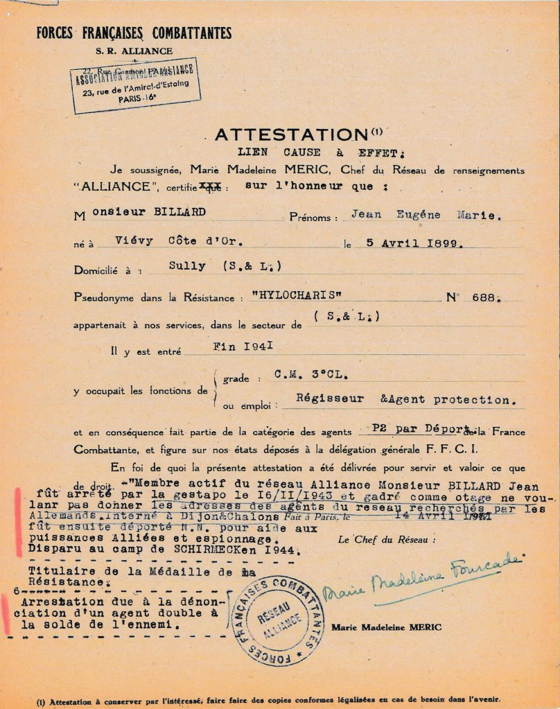 Arrêté par la Gestapo le 16 novembre 1943, Jean Billard fut interné à Dijon puis déporté sous le régime Nacht und Nebel en mars 1944. Malgré les interrogatoires et la torture, il n’a jamais dénoncé ses camarades résistants. Après son emprisonnement dans plusieurs camps, notamment à Schirmeck et Wolfach, il fut finalement déporté à Dachau, où il est mort le 16 mars 1945.