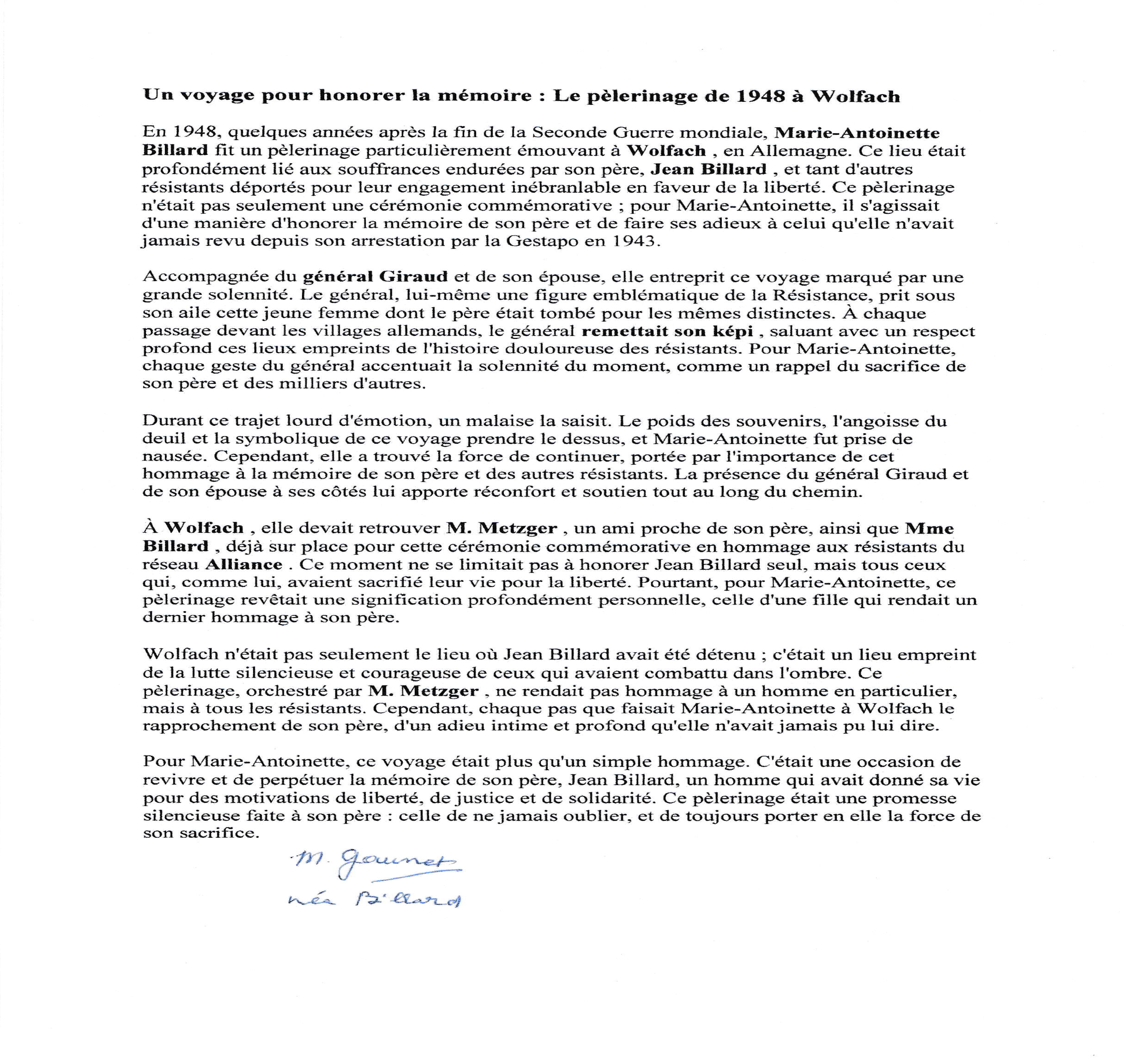 Puis, plus rien, jusqu’en 1945. De Dijon, mon père a été transféré à la prison de Schirmeck, toujours tenu au secret, puis à la forteresse de Wolfach, où il partageait sa cellule avec M. Cusin, photographe d’Autun. , et un jeune homme de 17 ans, Chanliau, de Broye. C’est là qu’il a fait la connaissance de M. Metzger de Strasbourg et du chef de gare. M. Cusin et M. Metzger, revenus de déportation, nous avons raconté les événements avec respect et tristesse. Ils entendaient les canons de la libération. Au moment des mouvements dans la prison, ils avaient convenu de tenter une attaque contre les surveillants.