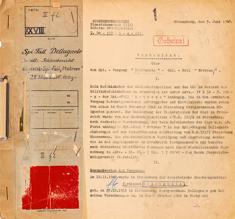 Spi-Fall Dellagnolo – Matrose (matelot) et Spionage Organisation Alliance : ces noms de code révèlent les étapes de l’enquête conjointe menée par la Gestapo de Strasbourg et la SIPO-SD parisienne pour faire tomber, à deux reprises, les membres du réseau Alliance, créé par Georges Loustaunau-Lacau dès le printemps 1941.